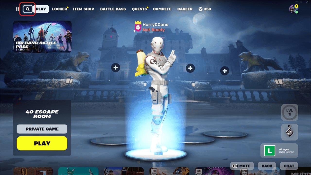 - Launch Fortnite and select the Search option in the upper left corner of the game menu.