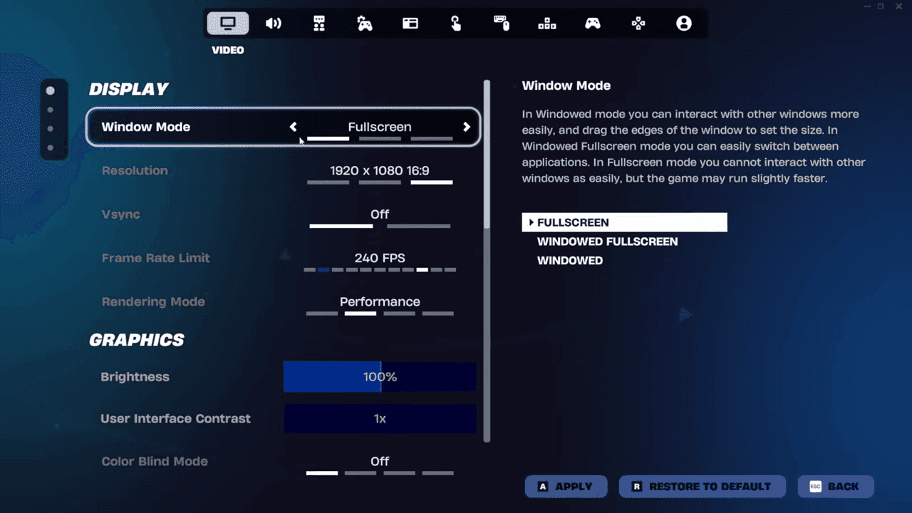 - Window Mode → Fullscreen