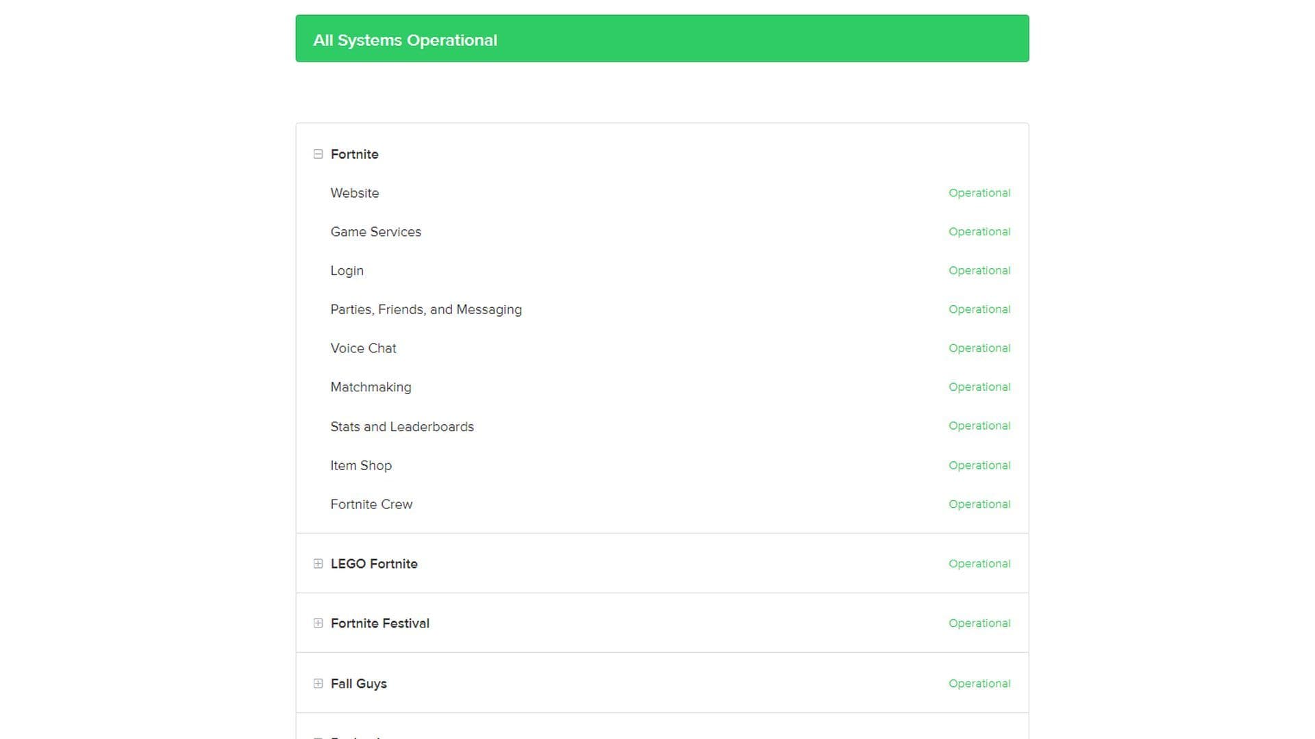 - Check Fortnite server status: Before doing anything else, verify if the Fortnite servers are experiencing any problems. Visit the official Fortnite Twitter page or the Epic Games status website for real-time updates on server status and maintenance schedules. If there is no problem on Fortnite, the site will be shown like this: