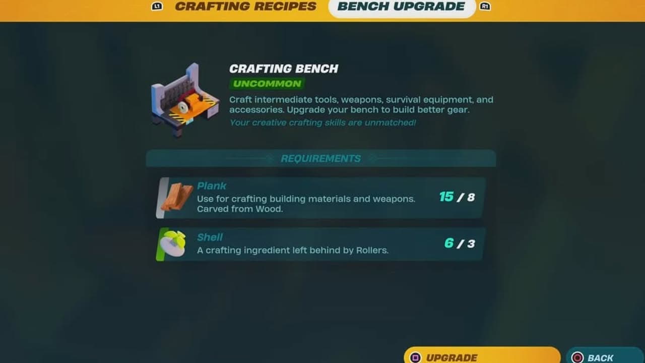 - Upgrade: Once you have these materials, go to your Crafting Bench and upgrade it to level two.