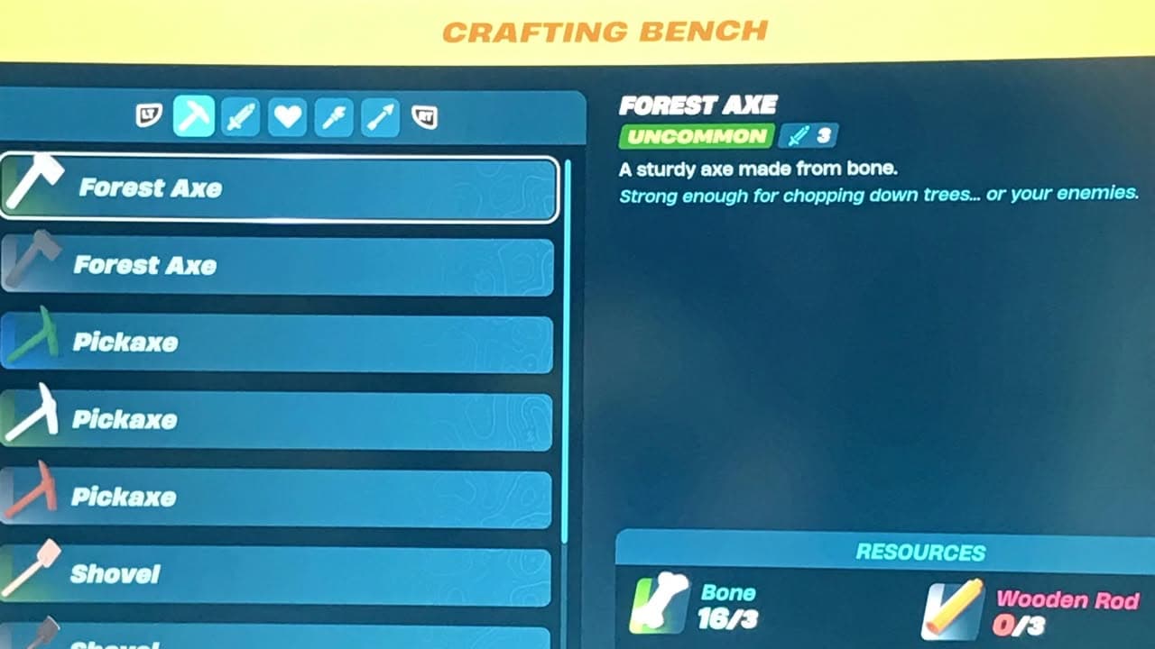 With your upgraded Crafting Bench, you can now craft an uncommon Forest Axe. To do this, you need: