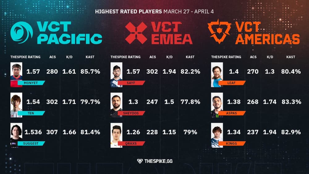 - VCT 2023 Internationalリーグの週間ベストプレイヤーとチームランキング:3月27日~4月4日VCT 2023 Internationalリーグのこの1週間のベストパフォーマンス選手とチームランキングをご覧ください。EMEA、Pacific、Americasの各リーグから、ベストパフォーマーだった3名のプレイヤーを選んでいます。
