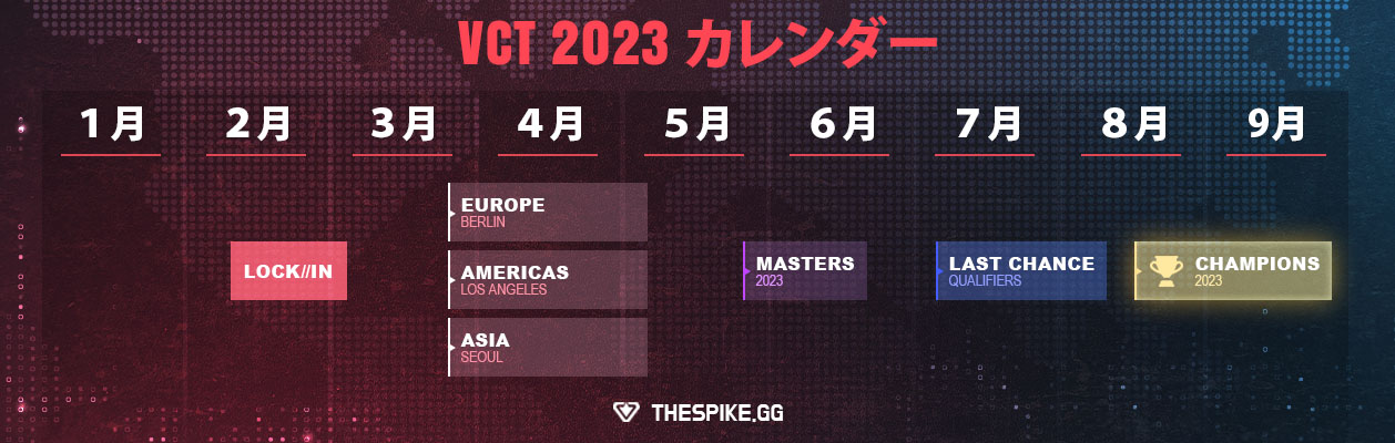VALORANT Champions Tour 2023(VCT2023)は、ブラジルのサンパウロで開催される一度限りの特別なキックオフイベントからスタートします。LOCK//IN」と名付けられたこのイベントには、アメリカ、EMEA、Pacificの3つの地域からVCT 2023に参加する全チームが集結します。このイベントの勝者は、その地域の代表としてMasters Tokyoへの出場枠を追加で獲得することができます。
