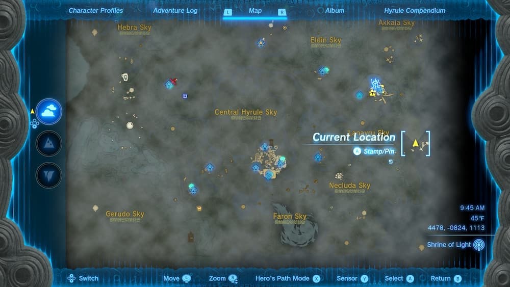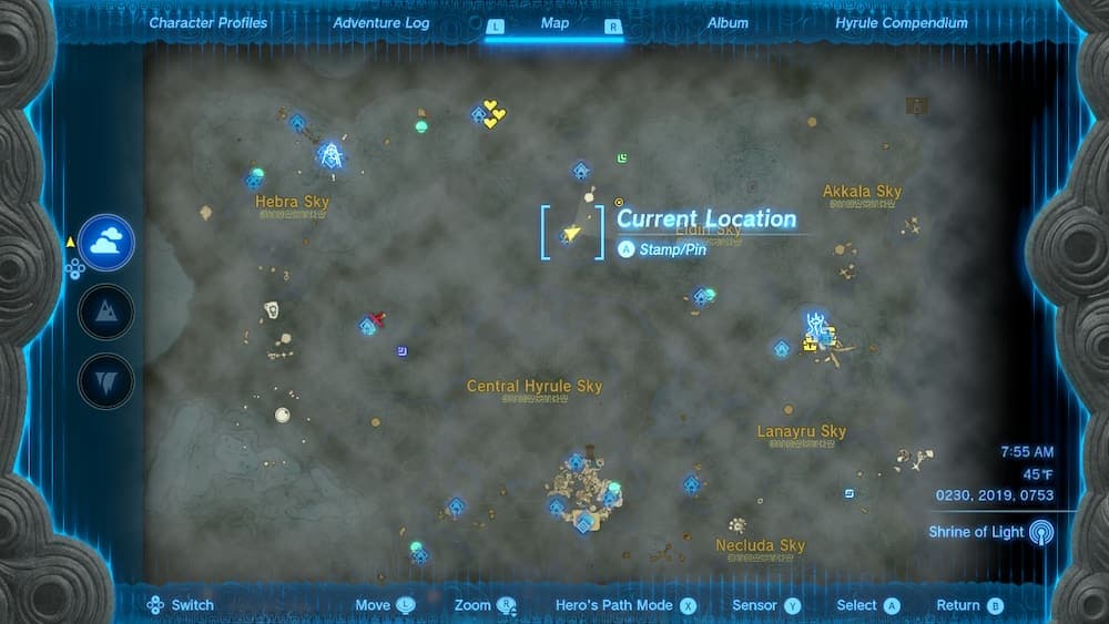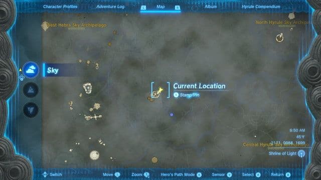 This time, head to the Mount Lanayru tower (coordinates 3846, -1307, 0539), launch into the sky, and glide in a north-easterly direction to Valor Island (coordinates 4544, -0845, 1121). Like getting the Glide Shirt and Tights, you’re aiming for the corkscrew-like island.