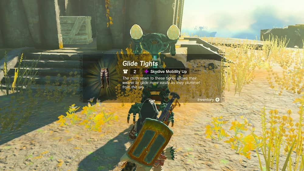 Like other Armor Sets in TotK, the Glide Set comprises a helm, chest armor, and leg armor. For this wingsuit, those items are the Glide Mask, the Glide Shirt, and the Glide Tights.