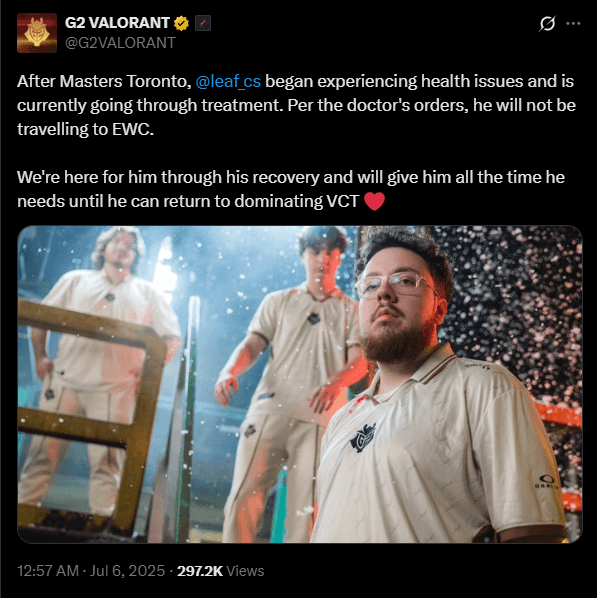 Just a day before the start of the EWC VALORANT - Esports World Cup 2025, G2 Esports announced that Nathan "leaf" Orf will not be attending the tournament in Riyadh due to ongoing health concerns. The organization shared the update via X, noting that leaf has been undergoing treatment since VALORANT Champions Tour 2025 - Masters Toronto 2025 and will not travel per doctor’s orders.