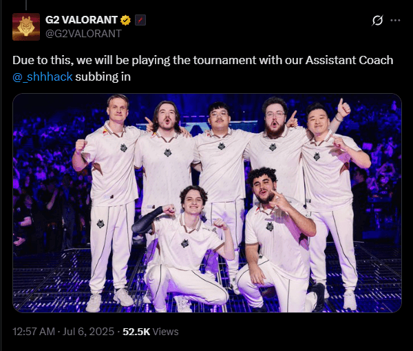 In a follow-up post, G2 confirmed that assistant coach Peter "shhhack" Belej will temporarily step into the starting roster to replace leaf. The decision comes at an incredibly tight juncture, with G2 set to face off against Karmine Corp in just two days.