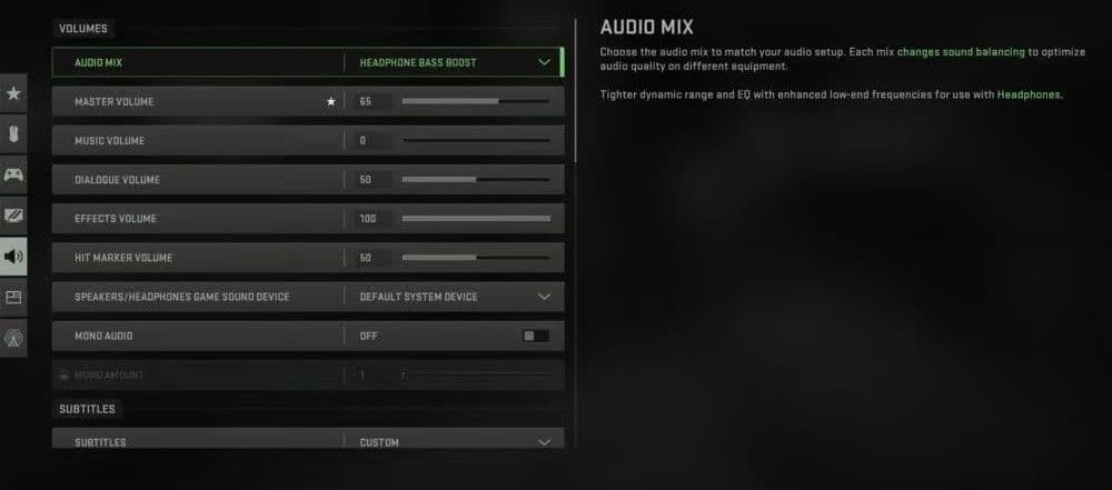 The audio settings you’ll find below are designed to minimize distractions and make sure you don't miss any important sound cues. We've chosen these settings to amplify key cues like enemy footsteps, that will help you identify enemy locations, stay alive, and get kills in the fast-paced short TTK world of Warzone 2.